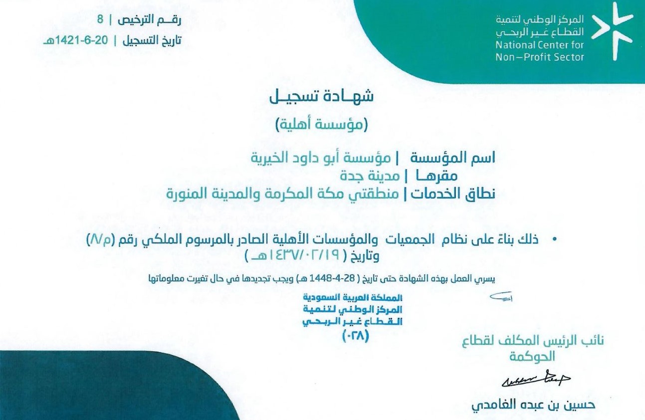 تأسست مؤسسة أبوداود الخيرية بمدينة جدة وتشمل بخدماتها منطقة مكة المكرمة ومنطقة المدينة المنورة طبقا لاحكام لائحة الجمعيات والمؤسسات الخيرية الصادرة بقرار مجلس الوزراء رقم (107) وتاريخ 25/6/1410 وقواعدها التنفيذية بقرار ويز العمل والشؤون الاجتماعية رقم (760) وتاريخ 30/1/1412 والتعليمات الصادرة بمقتضاها